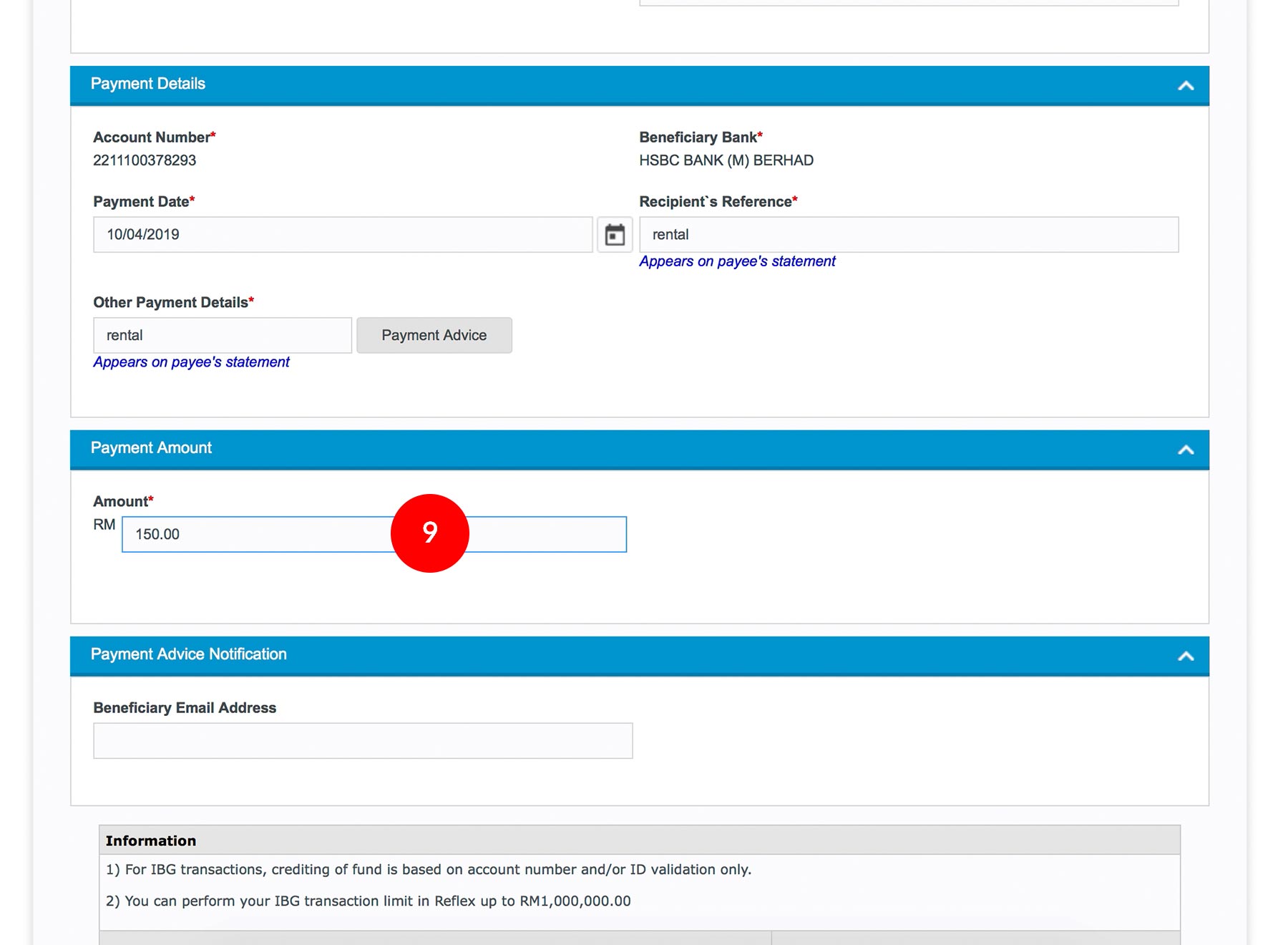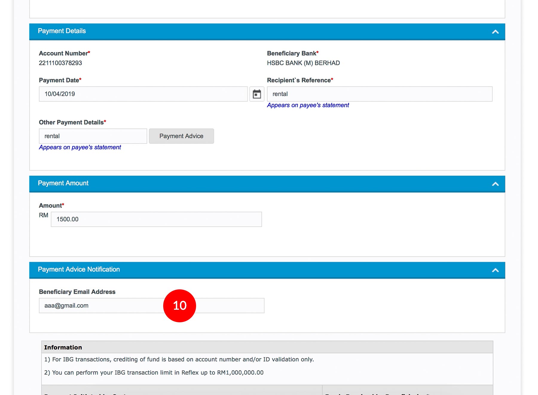 10.(Optional) Key in the Beneficiary’s email address for payment notification.