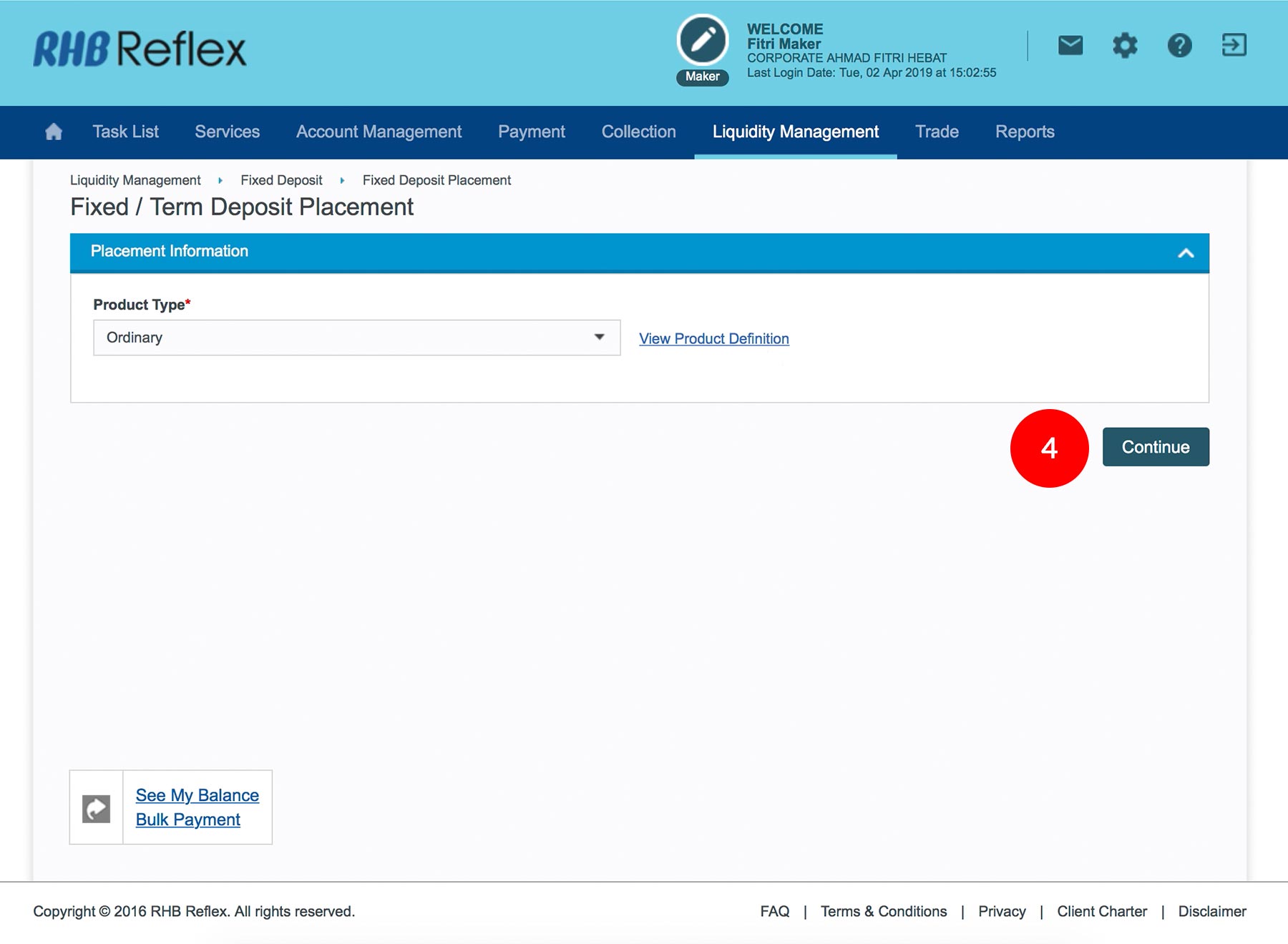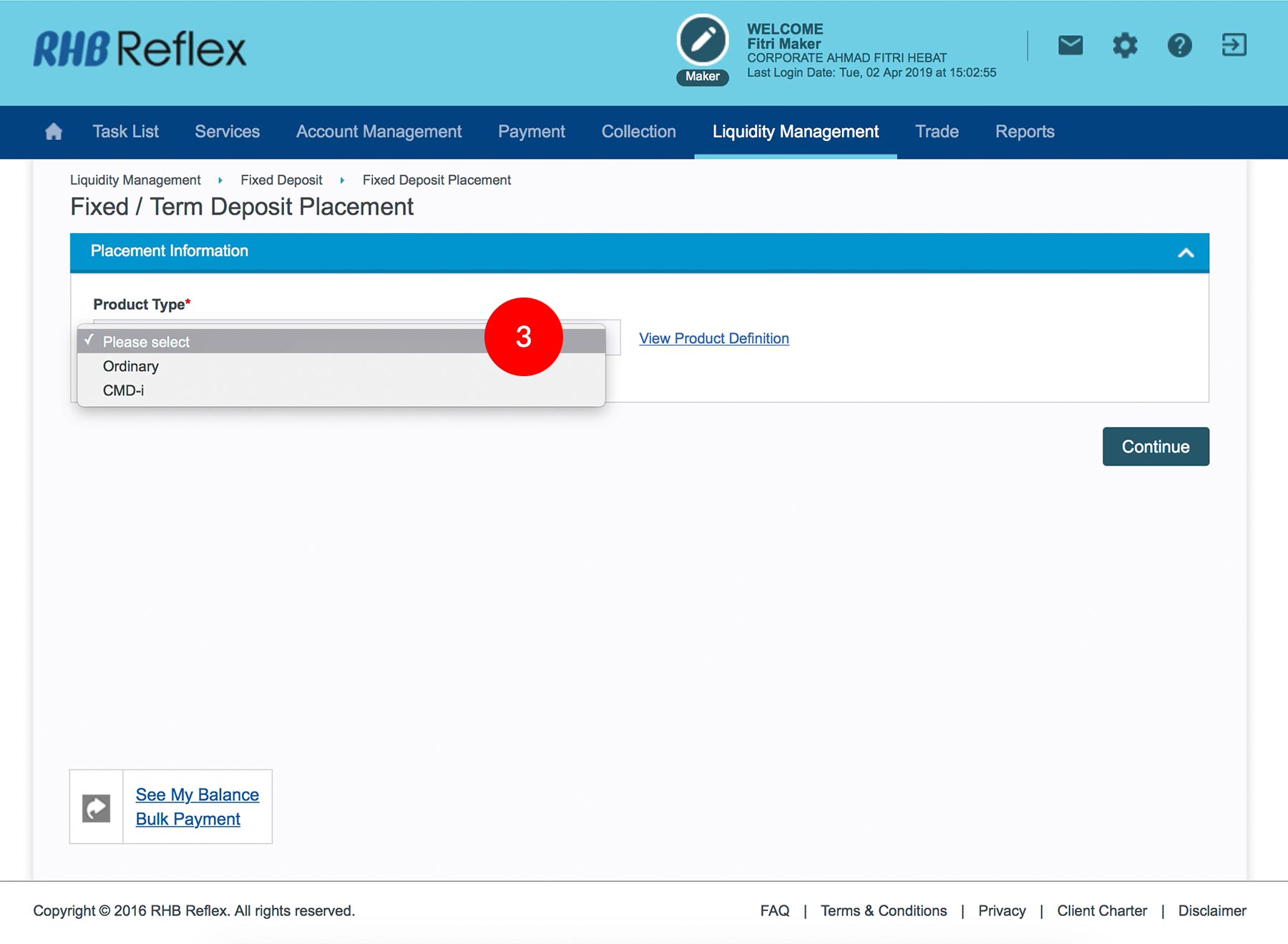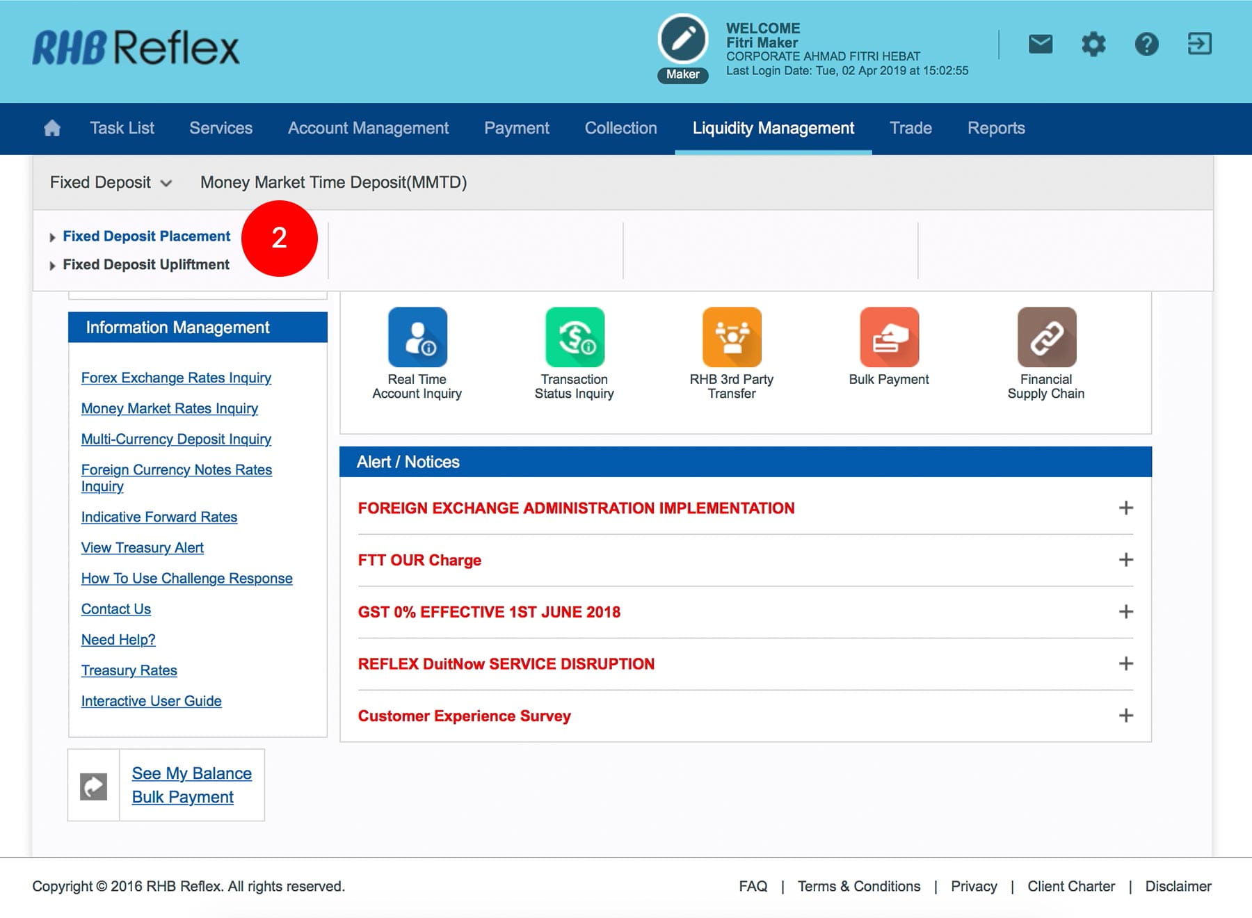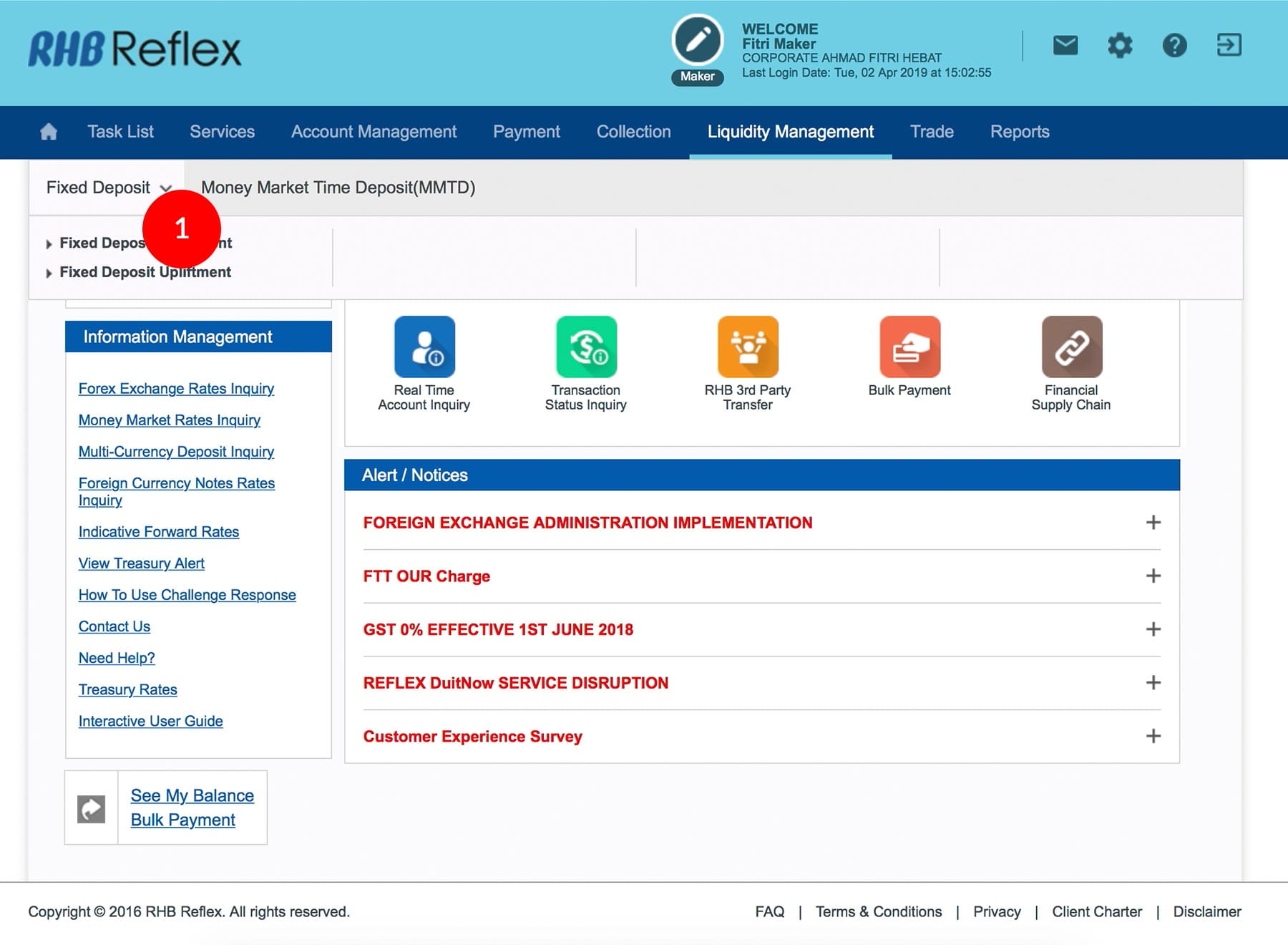 1.Login as Data Entry and under “Liquidity Management” select “Fixed Deposit”.
