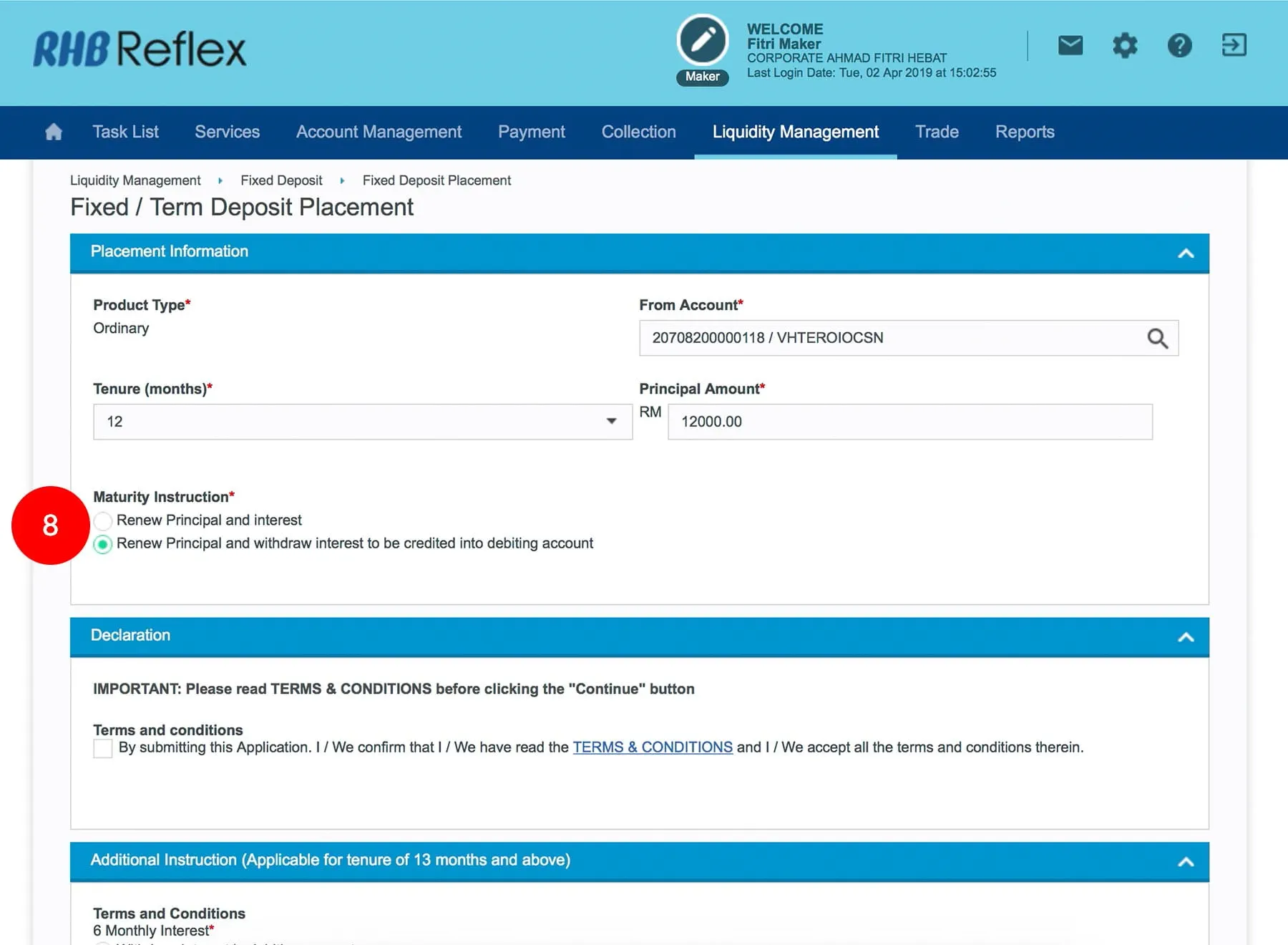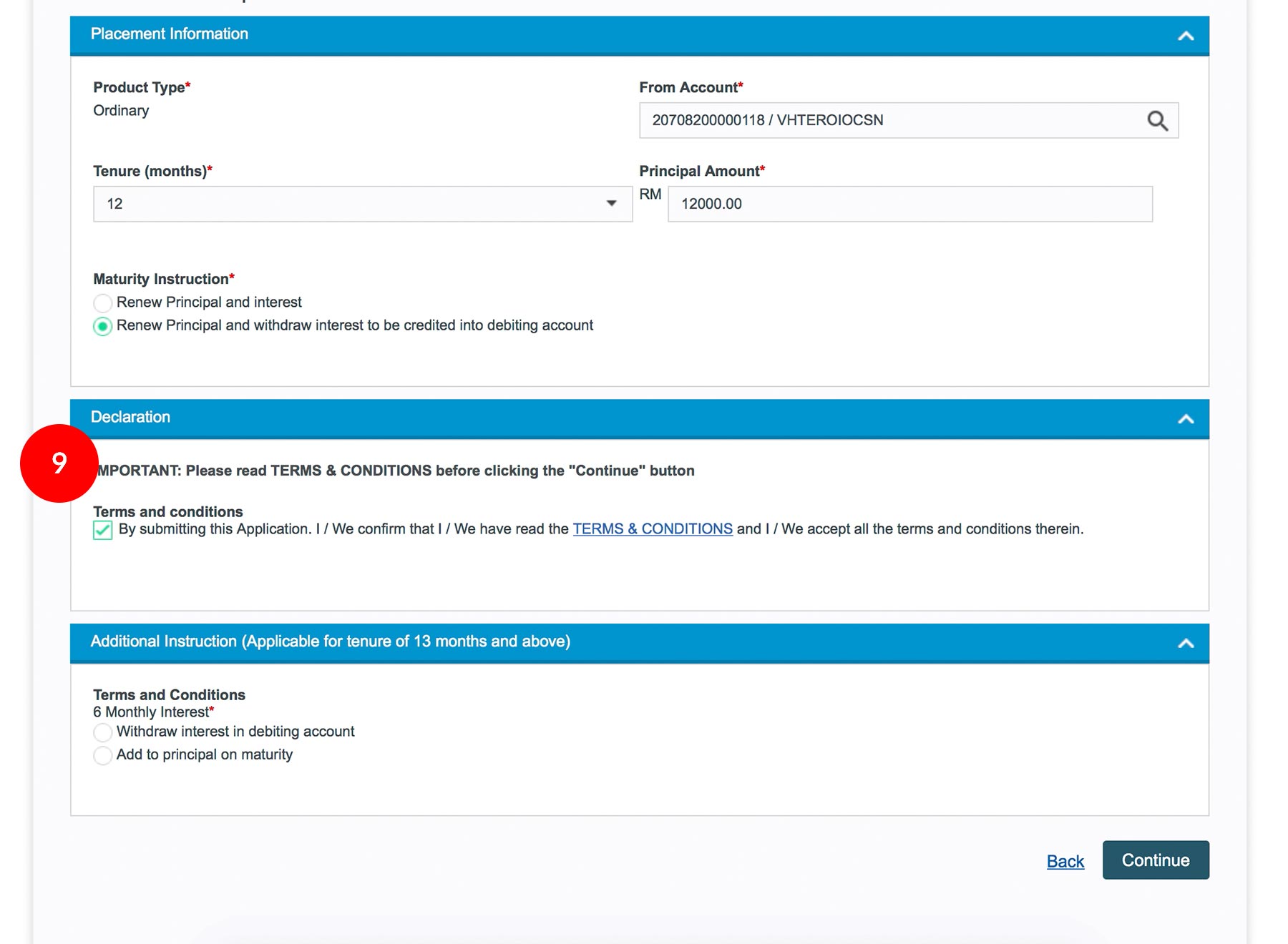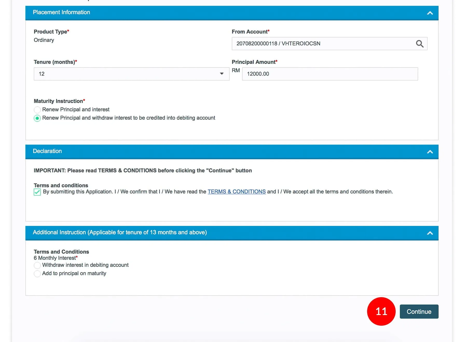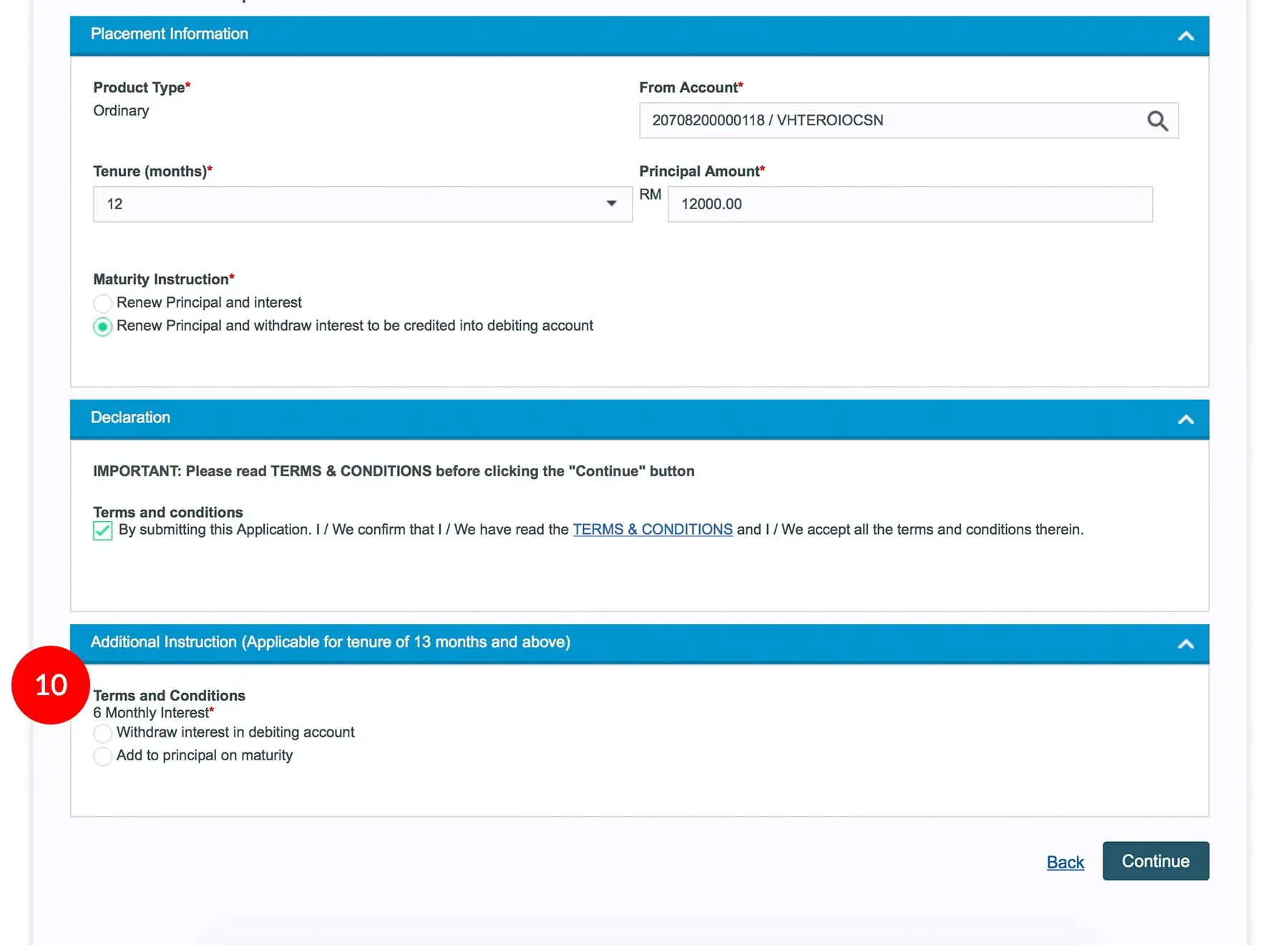 10.Select the Choice of Instruction for placement Fixed Deposit 13 months and above.