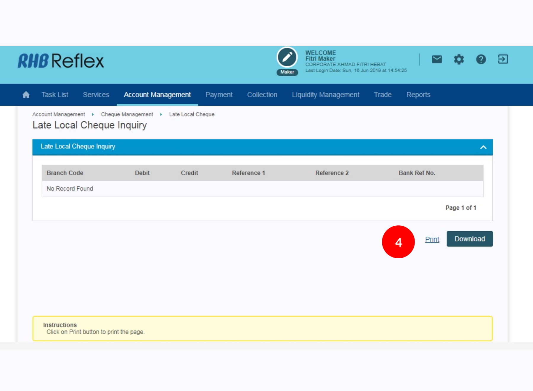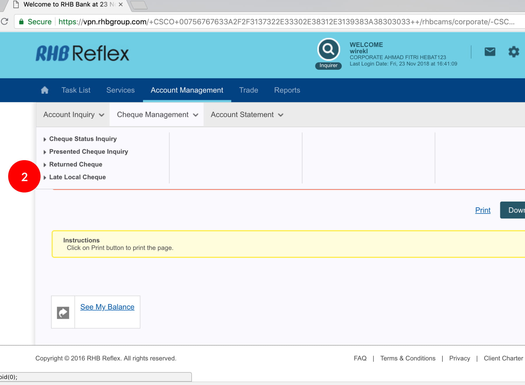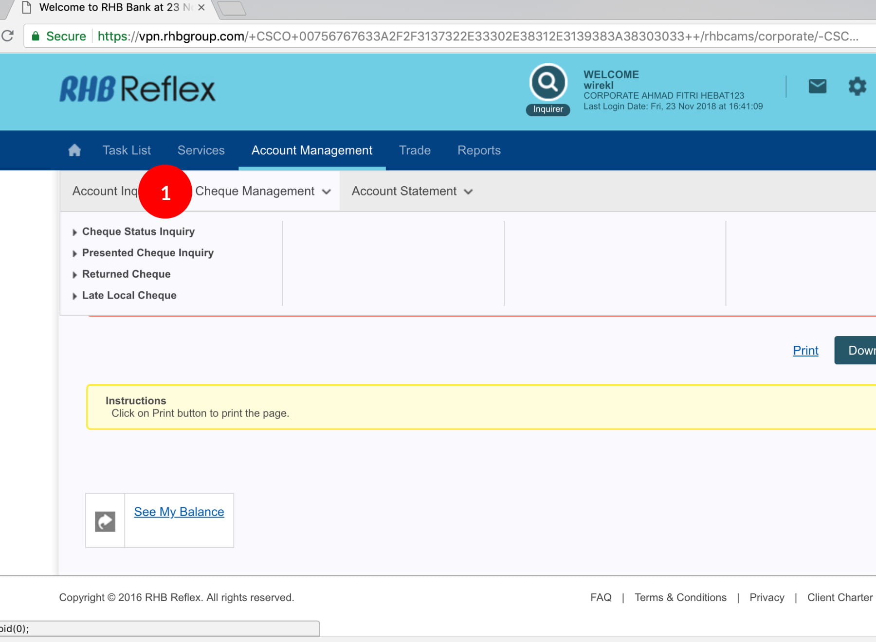 1.Login as User and under “Account Management” tab; select “Cheque Management”