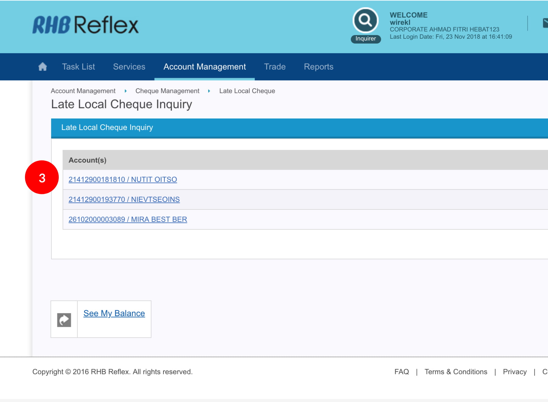 3.Click on the Account Number hyperlink to see the detailed cheque status.