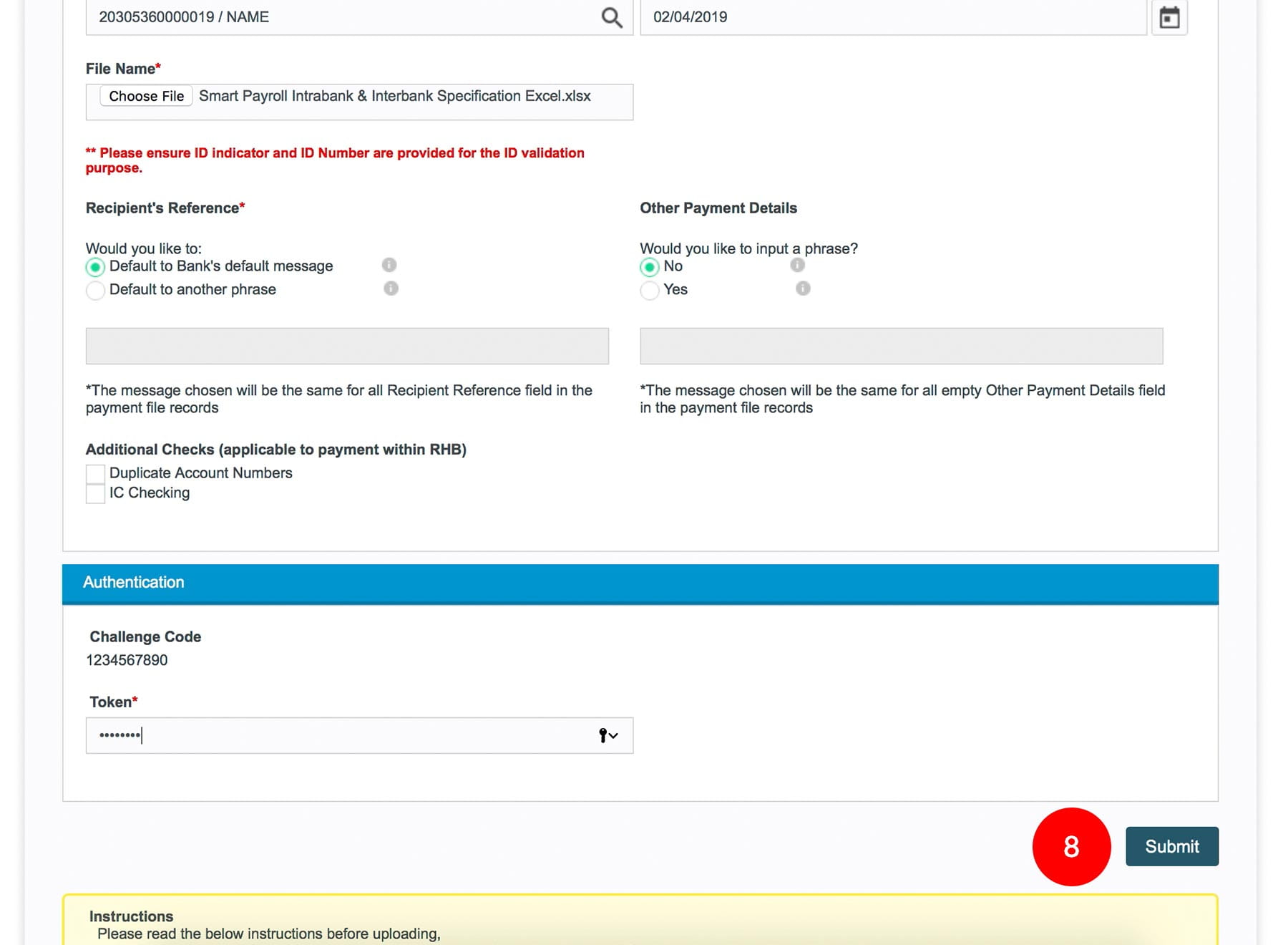 9.Click “Check Upload Status” to reconfirm whether the transaction has been sent for approval. If the transaction does not follow the file format, it will be returned unsuccessful. Click on the Reasons to view the details of the transaction which required amendment and thereafter re-upload again for approval.