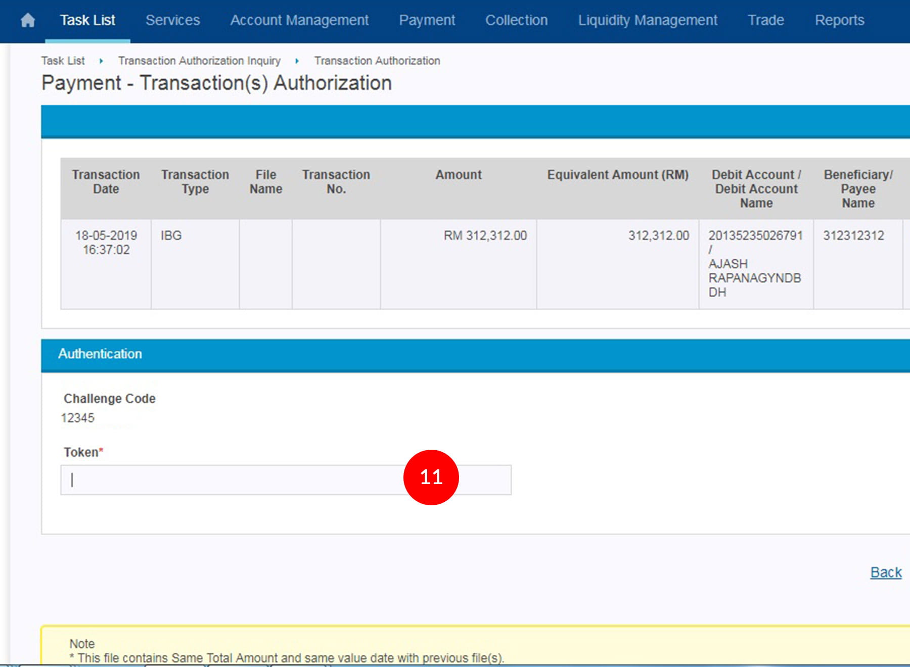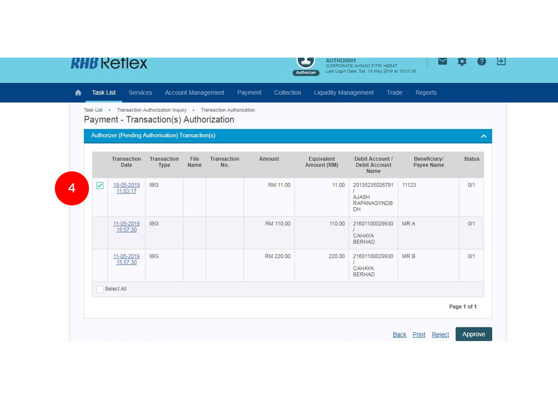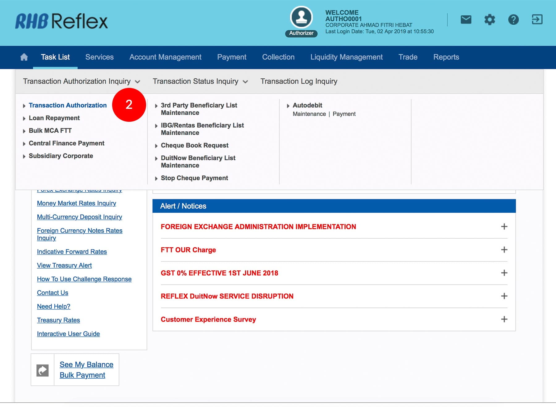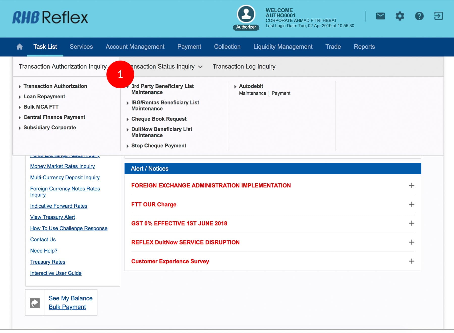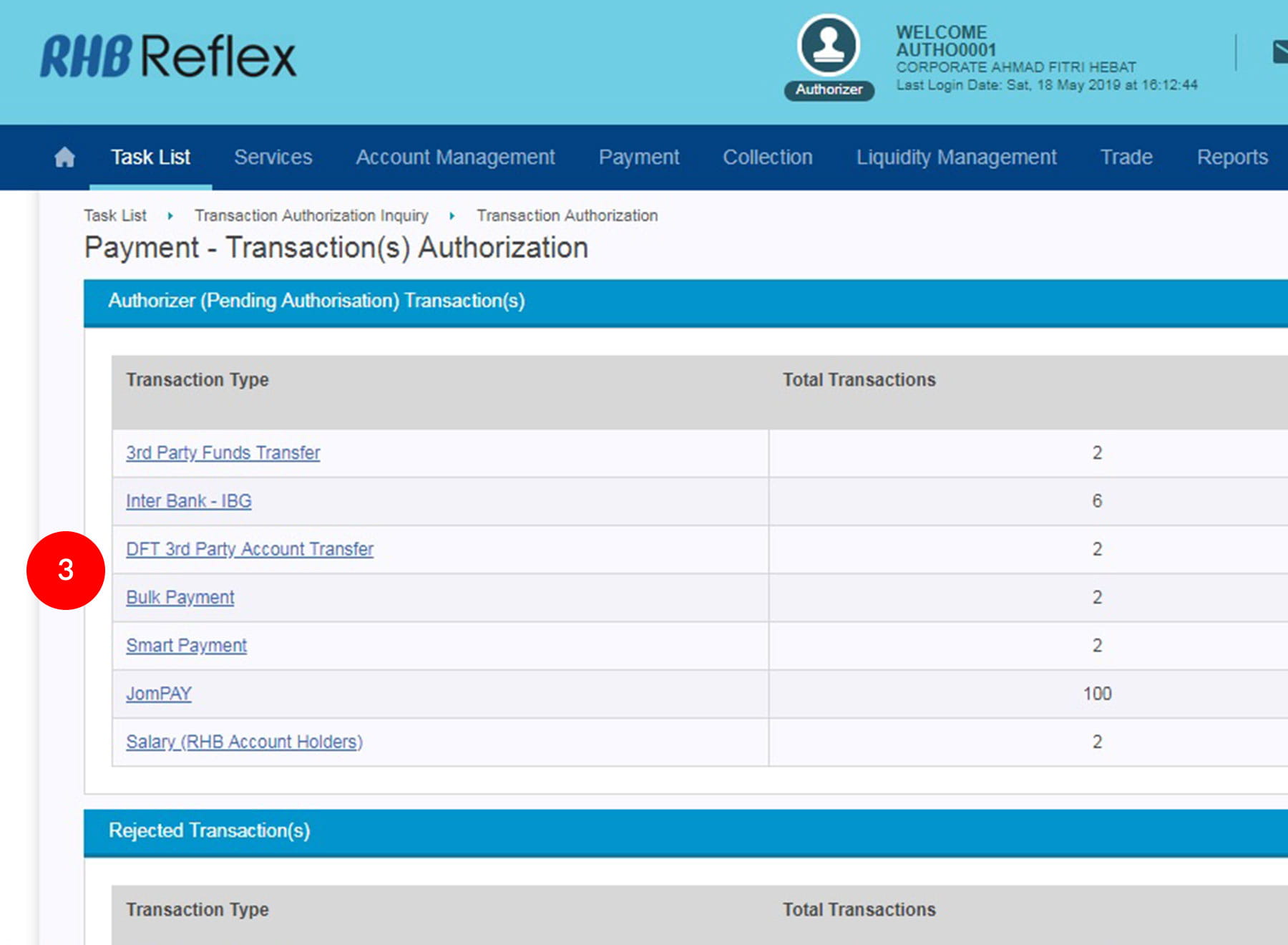 1.Login as Authoriser. Click "Task List" & "Transaction Authorization Inquiry".