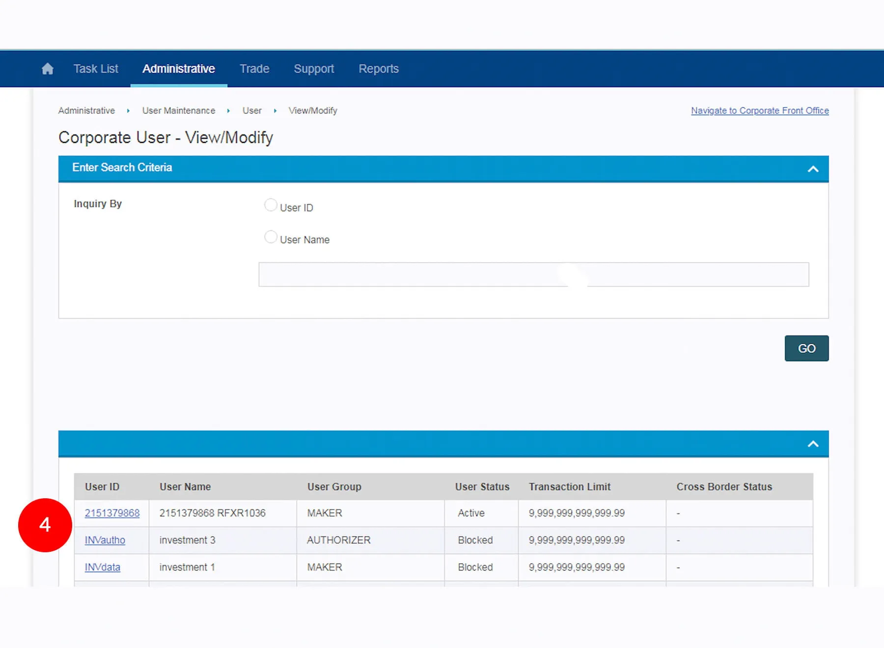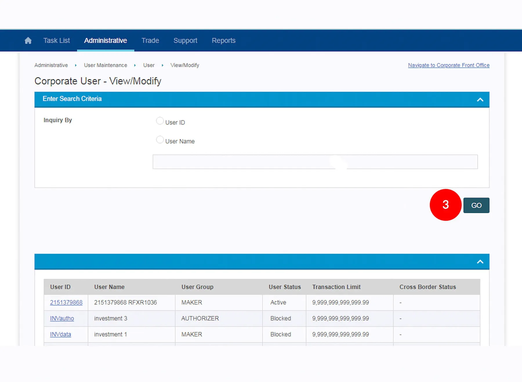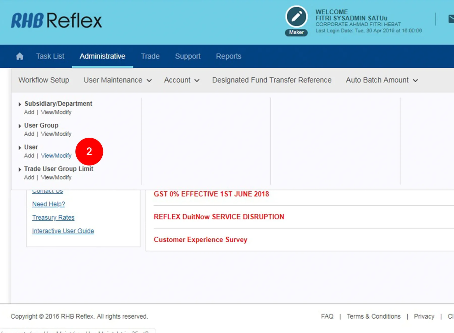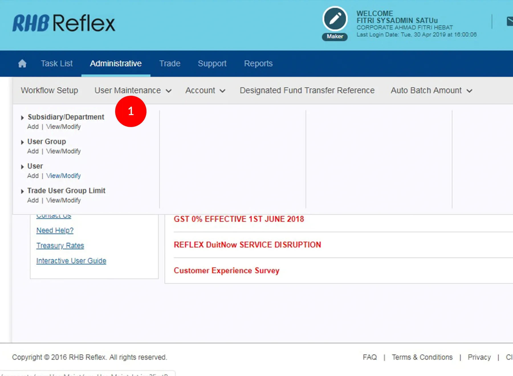 1.Login as sysadmin1 and under the “Administrative” tab; select ““User Maintenance”;