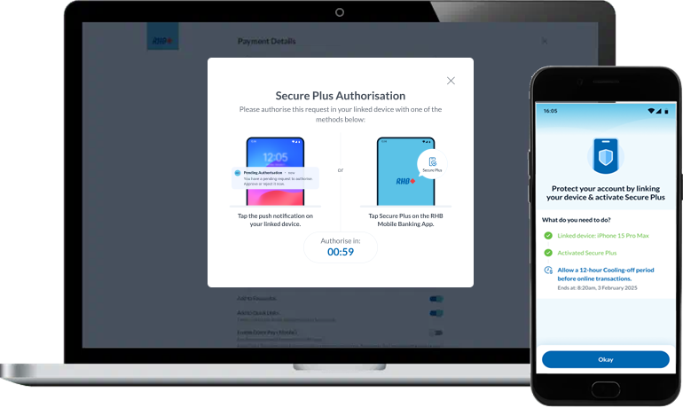 Transition effortlessly and securely between your mobile and browser with the improved RHB Online Banking experience.