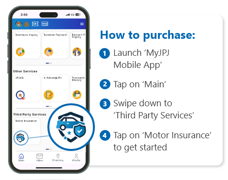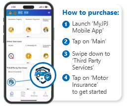 Open to all customers who purchase Car or Motorcycle Insurance via JPJ Public Portal, MyJPJ Mobile App or at selected JPJ Self-Service Kiosks.