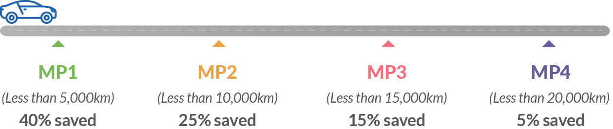 E.g. Say you have purchased MP4. If at the time of accident the miles travelled is less than 20,000km, the claim will be paid in full. If the miles travelled exceeds 20,000km, the claim will be paid partially and you will have to bear part of the cost in the same percentage as the premium rebate, in this case 5%. The miles travelled is the difference between the odometer readings at the time of purchase and at the time of accident.