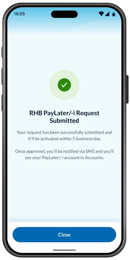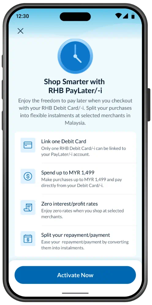Activate RHB PayLater/-i via the RHB Mobile Banking App under the ‘Highlights’ section.