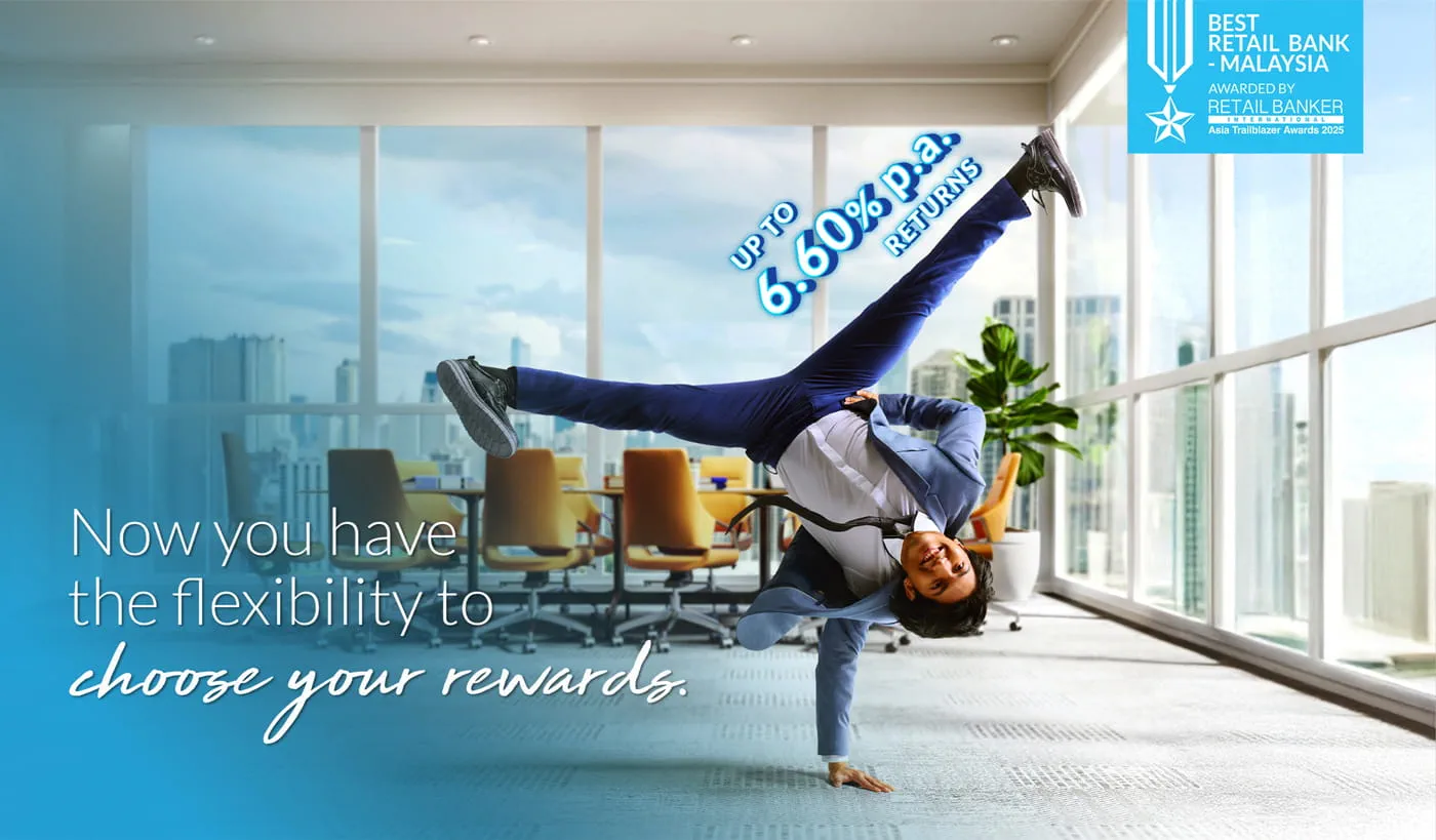 Enjoy Bonus Rates of up to 6.60% p.a. Simply deposit a minimum of RM2,000, then sign up for Joy@Work, pay bills, spend, convert, trade, finance or invest.