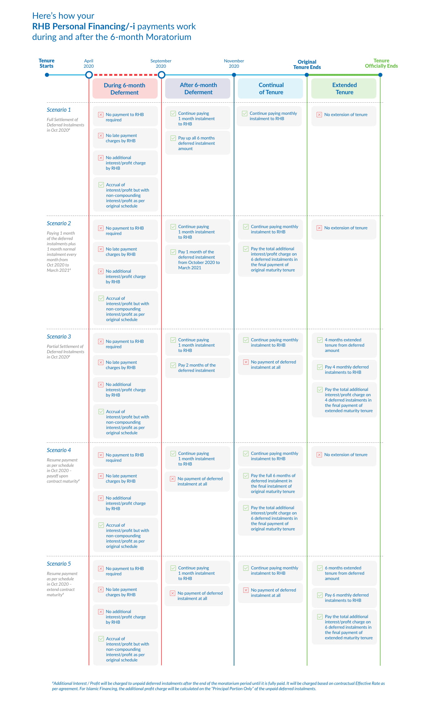Your loan/financing payment is deferred for 6 months and loan/financing tenure is extended for 6 months. During the deferment of instalments / moratorium period, interest/profit will continue to accrue and this would increase the total repayment / payment amount. However, the interest/profit charged during this deferment of instalments / moratorium period is not compounded.